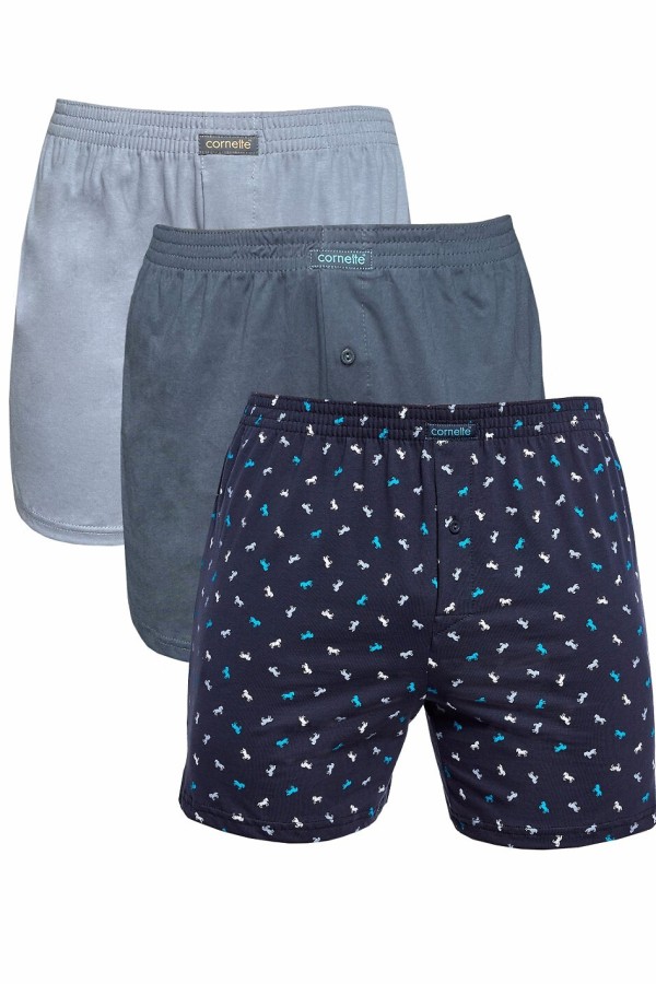 Boxeri pentru barbati realizati din bumbac de inalta calitate cu adaos de fibre elastice. Boxerii au croiala lejera, talie elastica confortabila si se inchid in zona slitului cu un nasture. In pret sunt incluse 3 bucati: una grafit uni, una gri uni si una grafit cu model deosebit cu armasari, toate ambalate intr-o punga de plastic.