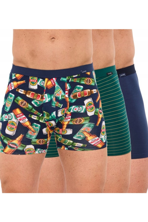 Boxeri pentru barbati realizati din bumbac de inalta calitate cu adaos de fibre elastice. In pret sunt incluse 3 bucati: una bleumarin uni, una verde cu dungi si una bleumarin cu model deosebit cu doze si sticle de bere, toate ambalate intr-o punga de plastic.