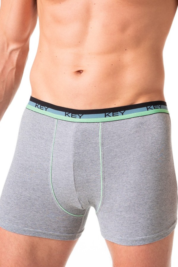 Boxeri pentru barbati realizati din bumbac de inalta calitate, cu proprietati antialergice. Boxerii sunt infrumusetati pe partea frontala cu cusaturi decorative in nuanta contrastanta si au talie elastica confortabila, decorata cu dungi colorate si cu inscriptia repetitiva "KEY".