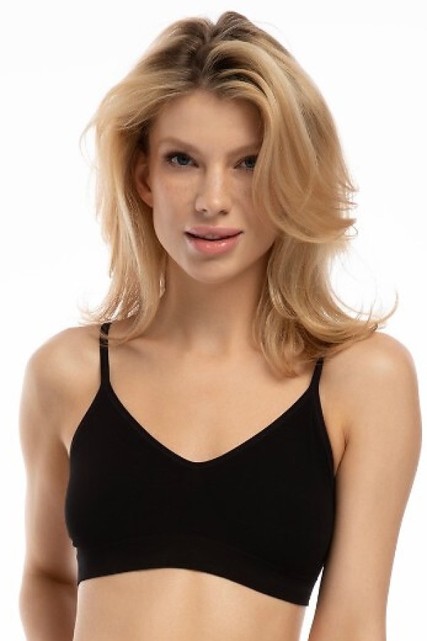 Bustiera de dama realizata din tesatura de inalta calitate cu ajutorul tehnologiei cu laserul, avand un finisaj ultra-subtire. Cupele sunt soft (neintarite) si nu au armatura metalica. Pentru un plus de confort, partea de sub bust este sustinuta de o banda elastica. Bustiera nu este prevazuta cu sistem de inchidere (se baga pe cap). Bretelele sunt subtiri, inguste si nu se pot detasa. Bustiera este confectionata din fibre de bambus de inalta calitate, cu proprietati naturale antibacteriene si termoreglatoare (bambusul racoreste pielea in zilele fierbinti si ofera o caldura placuta in zilele mai reci), care permite pielii sa respire, oferindu-ti un sentiment de prospetime si confort. Model ideal atat pentru doamnele cu bust generos, cat si pentru gravide sau mamicile care alapteaza.