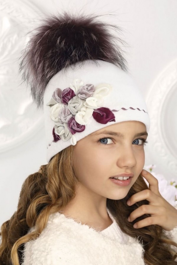 Caciula pentru fetite cu pompon din blanita WL10354 se evidentiaza prin accesorizare exceptionala iar croiala clasica permite caciulii sa ia forma capului, acoperind bine urechile si fruntea. Decorul de inspiratie florala aplicat in lateral sub forma unui buchet bogat de roze imprima o nota eleganta modelului. Bobocii de trandafir ce alcatuiesc buchetul sunt stilizati din catifea in culori pastelate. Partea inferioara a caciulii este accentuata cu o cusatura chic ce intregeste ansamblul decorativ. Pomponul supradimensionat din blanita naturala este detaliul care sporeste farmecul acesti caciuli. Pentru a face curatarea mai usoara, pomponul se poate detasa.
