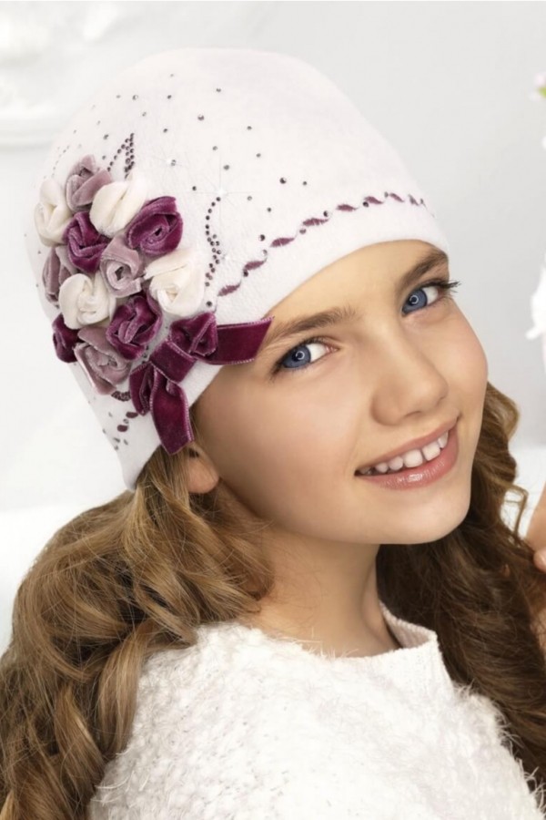 Caciula pentru fetite WL10227 are un design sofisticat si poate acompania tinutele cu tenta eleganta de scoala sau de plimbare. Impresioneaza prin asocierile cromatice vibrante si accesorizarea rafinata. Croiala clasica ce ia forma capului este echilibrata de numeroasele elemente ornamentale. In lateral se distinge decorul principal de inspiratie florala sub forma unui buchet de flori prins cu o fundita. Bobocii de trandafir ce alcatuiesc buchetul sunt stilizati din catifea in culori pastelate. Decorul este completat de jur imprejur de o aplicatie bogata de strasuri asortate. Partea inferioara a caciulii este accentuata cu o cusatura chic ce intregeste ansamblul decorativ.