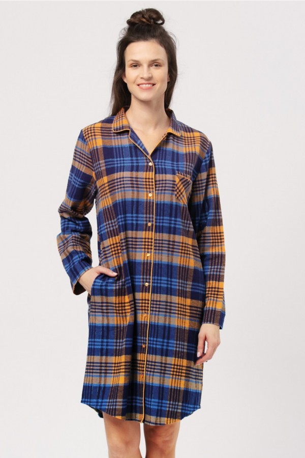 Camasa de noapte realizata din flanel din bumbac de inalta calitate, placut la atingere. Camasa este usor extinsa la spate, prezinta model deosebit cu carouri, are maneca lunga, decolteu finisat cu guler, se inchide pe partea frontala cu nasturi, este prevazuta cu un buzunar mic in zona pieptului si cu buzunare laterale in zona soldurilor.