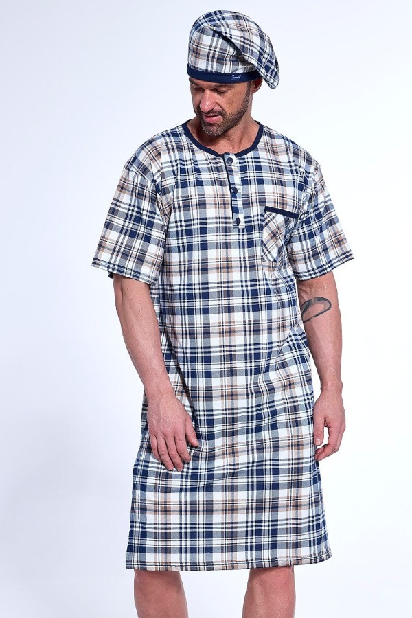 Camasa de noapte pentru barbati realizata din bumbac de inalta calitate. Camasa de noapte are maneca scurta, decolteu rotund ce se fixeaza cu nasturi, este prevazuta in zona pieptului cu un buzunar si prezinta model deosebit cu carouri. Boneta este inclusa in pret.