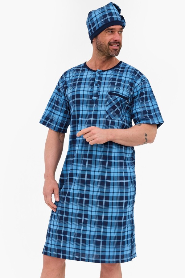 Camasa de noapte pentru barbati realizata din bumbac de inalta calitate. Camasa de noapte are maneca scurta, decolteu rotund ce se fixeaza cu nasturi, este prevazuta in zona pieptului cu un buzunar si prezinta model cu carouri. Boneta este inclusa in pret.