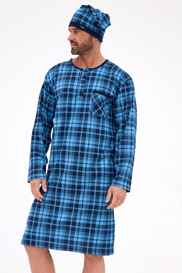 Camasa de noapte pentru barbati realizata din bumbac de inalta calitate. Camasa de noapte are maneca lunga, decolteu rotund ce se fixeaza cu nasturi, este prevazuta in zona pieptului cu un buzunar si prezinta model deosebit cu carouri. Boneta este inclusa in pret.