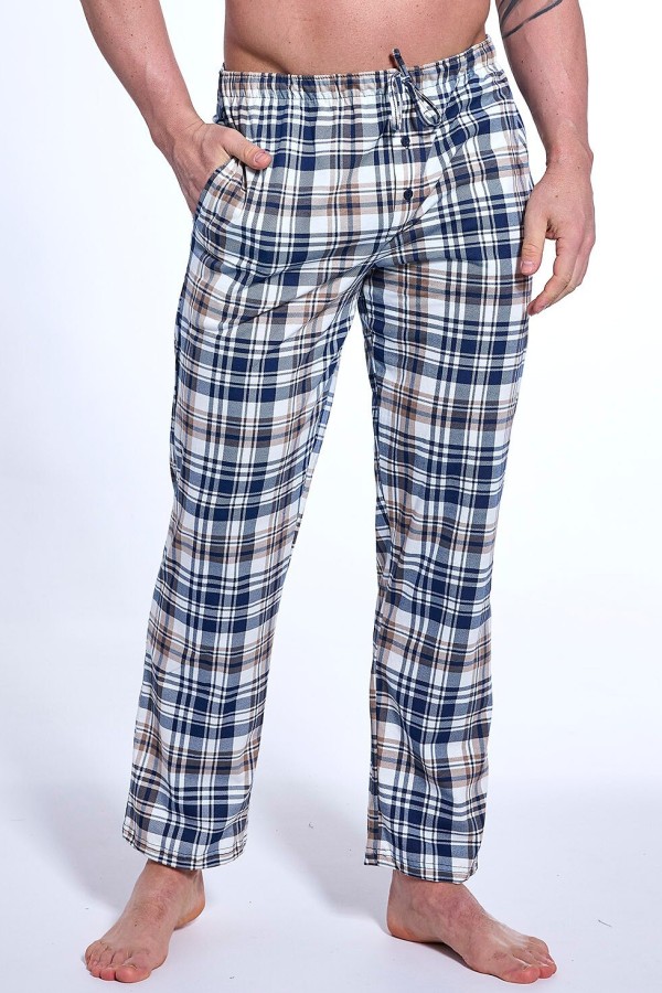 Pantalon de pijama pentru barbati realizat din bumbac de inalta calitate. Pantalonul este lung, are talie elastica confortabila, prezinta model deosebit cu carouri, este prevazut cu buzunare laterale, are slit ce se fixeaza cu doi nasturi si se ajusteaza in talie cu ajutorul unui snur.