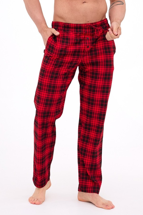 Pantalon de pijama pentru barbati realizat din bumbac de inalta calitate. Pantalonul este lung, are talie elastica confortabila, prezinta model deosebit cu carouri, este prevazut cu buzunare laterale, are slit ce se fixeaza cu ajutorul a doi nasturi si se ajusteaza in talie cu ajutorul unui snur.
