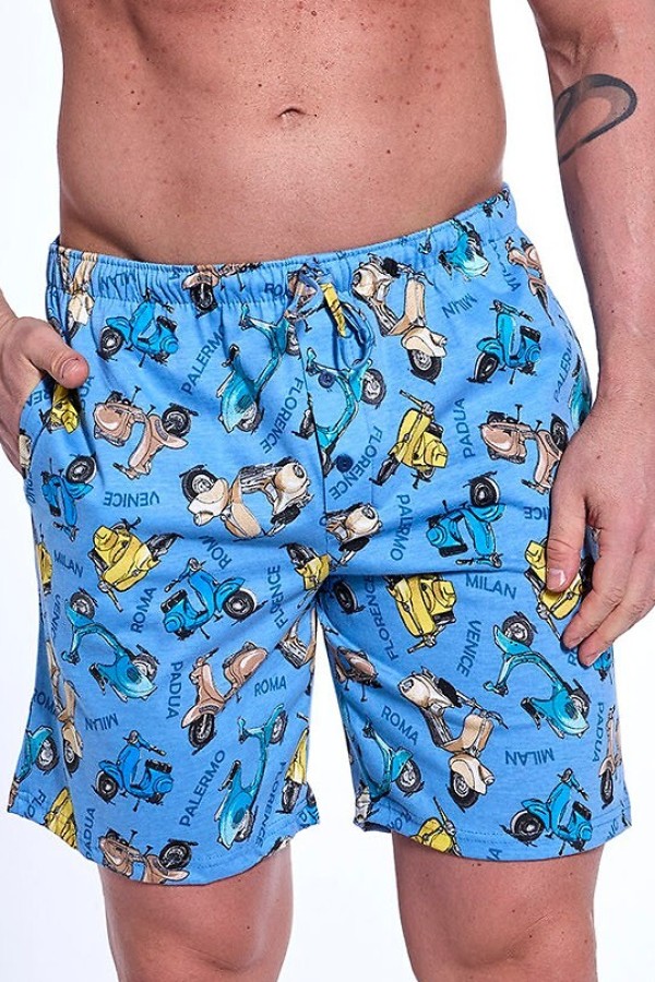 Pantalon de pijama pentru barbati realizat din bumbac de inalta calitate. Pantalonul este scurt, are talie elastica confortabila, prezinta model deosebit cu scutere si inscriptii cu diferite nume de orase italienesti, este prevazut cu buzunare laterale, are slit ce se fixeaza cu ajutorul a doi nasturi si se ajusteaza in talie cu un snur.