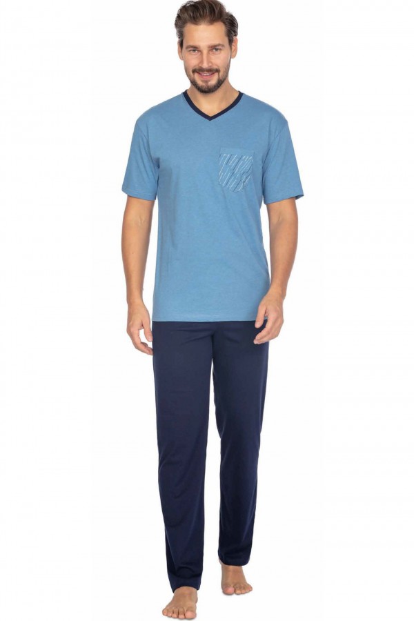 Pijama pentru barbati realizata din bumbac de inalta calitate. Pijamaua este compusa din 2 piese. Bluza are maneca scurta, decolteu in V finisat cu insertie de tesatura in nuanta contrastanta si este prevazuta in zona pieptului cu un buzunar cu model deosebit. Pantalonul este lung, uni sau melanj si are talie elastica confortabila.