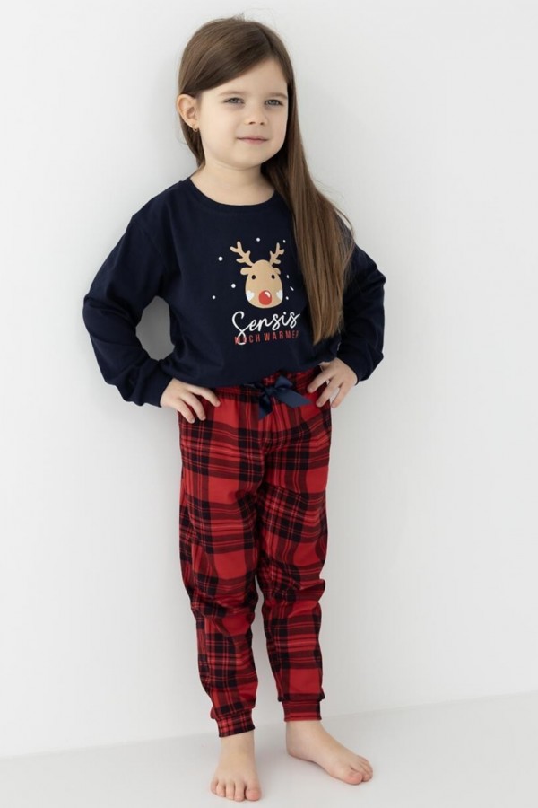 Pijama pentru fetite realizata din bumbac de inalta calitate, o alegere ideala pentru a sublinia magia si frumusetea atmosferei festive de Craciun. Pijamaua este compusa din 2 piese. Bluza are maneca lunga finisata cu manseta, decolteu rotund si este infrumusetata pe partea frontala cu un imprimeu colorat cu un ren, precum si cu inscriptia "Sensis Much warmer". Pantalonul este lung, are talie elastica confortabila decorata cu o fundita cocheta in nuanta bluzei, prezinta model deosebit cu carouri si este finisat in partea inferioara cu mansete.