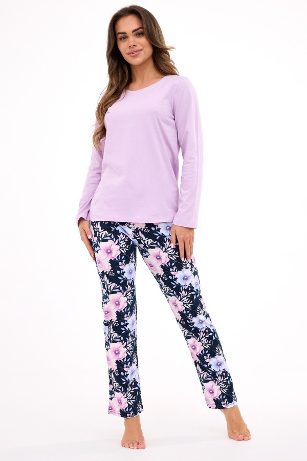 Pijama de dama realizata din bumbac de inalta calitate. Pijamaua este compusa din doua piese. Bluza este uni, are maneca lunga si decolteu semicircular, iar pantalonul este lung, prezinta model floral deosebit si are talie elastica confortabila.