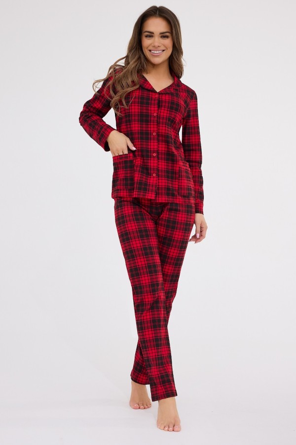 Pijama de dama realizata din bumbac de inalta calitate. Pijamaua prezinta model deosebit cu carouri si este compusa din 2 piese. Bluza are maneca lunga finisata cu manseta, decolteu in V finisat cu guler, este prevazuta cu buzunare pe partea frontala si se inchide in fata cu nasturi, iar pantalonul este lung si are talie elastica confortabila.