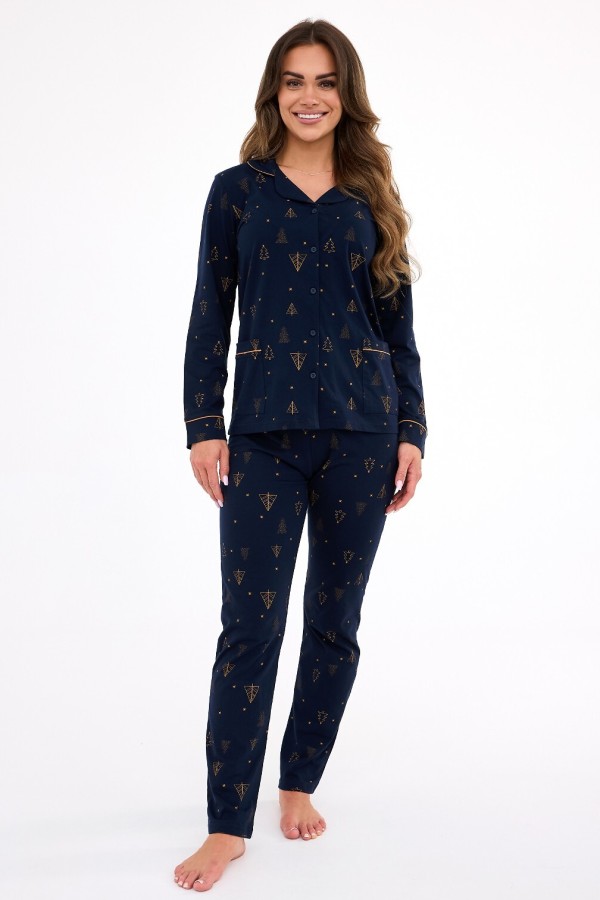 Pijama de dama realizata din bumbac de inalta calitate, o alegere ideala pentru a sublinia magia si frumusetea atmosferei festive de Craciun. Pijamaua prezinta model auriu deosebit cu brazi si stelute si este compusa din 2 piese. Bluza are maneca lunga finisata cu manseta, decolteu in V finisat cu guler, este prevazuta cu buzunare pe partea frontala si se inchide in fata cu nasturi, iar pantalonul este lung si are talie elastica confortabila.