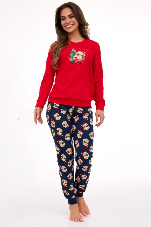 Pijama de dama din gama "Family" realizata din bumbac de inalta calitate, o alegere ideala pentru a sublinia magia si frumusetea atmosferei festive de Craciun. Pijamaua este compusa din 2 piese. Bluza are maneca lunga finisata cu manseta, decolteu rotund si este infrumusetata pe partea frontala cu un imprimeu colorat cu un ursulet de plus aflat langa un brad, in sania lui Mos Craciun. Pantalonul este lung, are talie elastica confortabila, prezinta model deosebit cu un ursulet de plus care tine un cadou si este finisat in partea inferioara cu mansete uni.