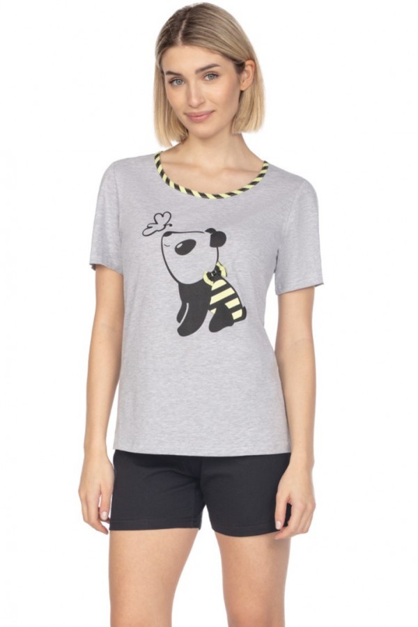 Pijama de dama realizata din bumbac de inalta calitate, compusa din 2 piese. Bluza are maneca scurta, decolteu semirotund finisat cu insertie de tesatura cu dungi si este infrumusetata pe partea frontala cu un imprimeu deosebit cu un panda pus in evidenta de o fundita cocheta si cu un fluture, iar pantalonul este scurt, uni si are talie elastica confortabila.