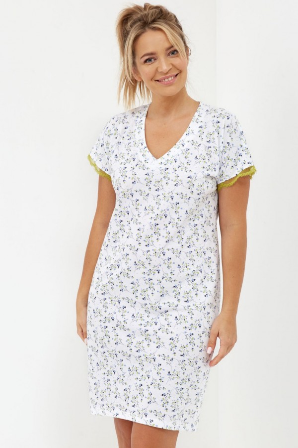 Rochie de noapte realizata din bumbac de inalta calitate, extrem de moale si de placut la atingere. Rochia prezinta model floral deosebit, are maneca scurta finisata cu panglica ornamentala din dantela in nuanta contrastanta si decolteu in V.