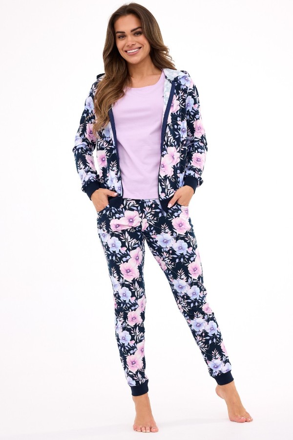 Trening de casa realizat din bumbac de inalta calitate, compus din 3 piese: pantalon lung, tricou uni si hanorac. Hanoracul prezinta model floral deosebit, are maneca lunga finisata cu mansete, gluga, buzunare si se inchide pe partea frontala cu fermoar. Pantalonul este lung, are talie elastica confortabila, prezinta model floral, este prevazut cu buzunare laterale si finisat in partea inferioara cu mansete. Mansetele si partea inferioara a hanoracului sunt confectionate din tesatura uni. Treningul poate inlocui cu succes o pijama de dama.